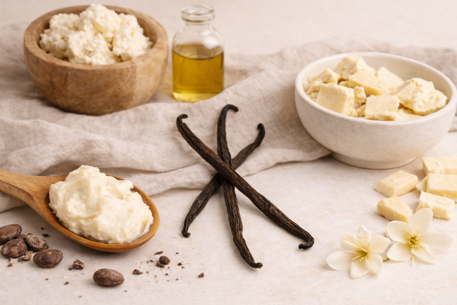 This luxurious cream blends organic shea butter with jojoba oil and vitamin E, creating a smooth, whipped texture that melts effortlessly on contact. Infused with premium vanilla essential oil, it leaves behind a warm, comforting scent inspired by white chocolate — subtle, cozy, and never overpowering.